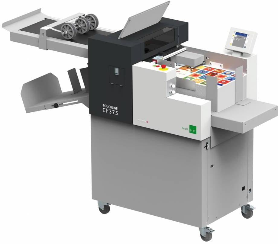 De CF-375 is een unieke ril- en vouwmachine uit het Touchline-gamma van de Zwitserse constructeur Multigraf/Eurofold. Eender welk vouwpatroon en formaat wordt ingesteld op een paar seconden. Dankzij 4 verschillende rilbalken verkrijgt men steeds de beste rilkwaliteit. De 2 ingebouwde mesvouwen zorgen ervoor dat elk document perfect afgewerkt wordt.