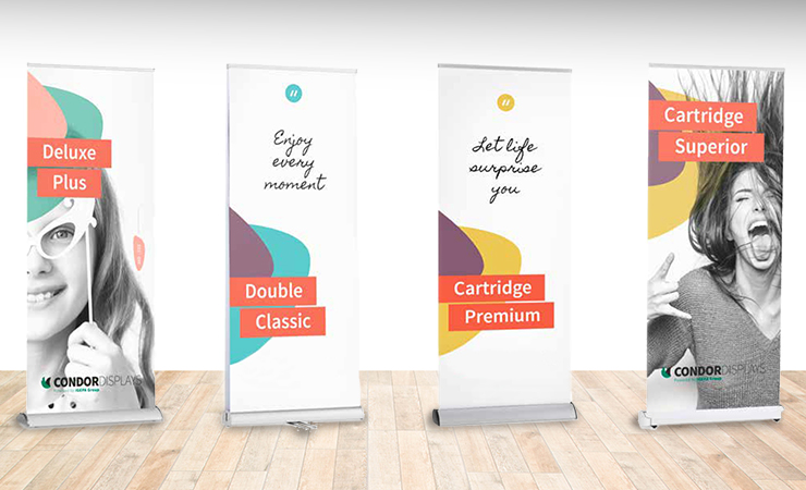 Une gamme complète de systèmes roll-up. Vous trouverez également le bon support d'impression à utiliser pour le roll-up.